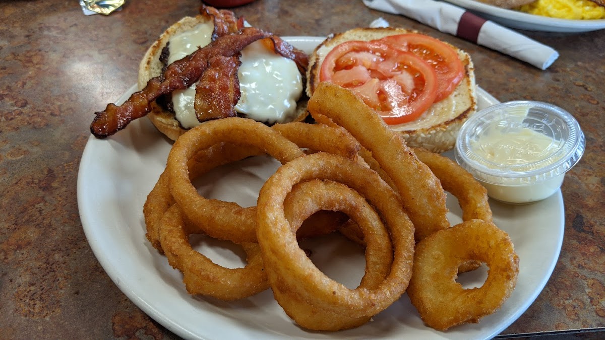 Beenz Burger w Onion Rings - A delicious, juicy burger topped with crispy onion rings, offering a satisfying and savory meal.